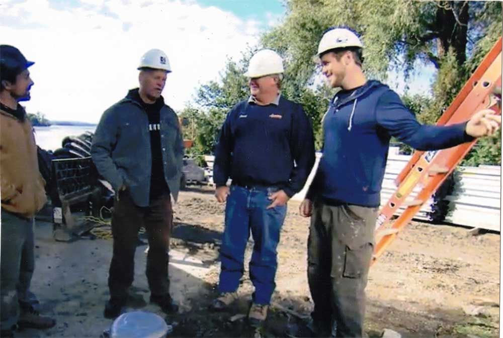 Dave Archer Jr. in Ivy Lea in the 1000 Islands with Mike Holmes and son working together on project. Shown on TV show, "Holmes On Homes"